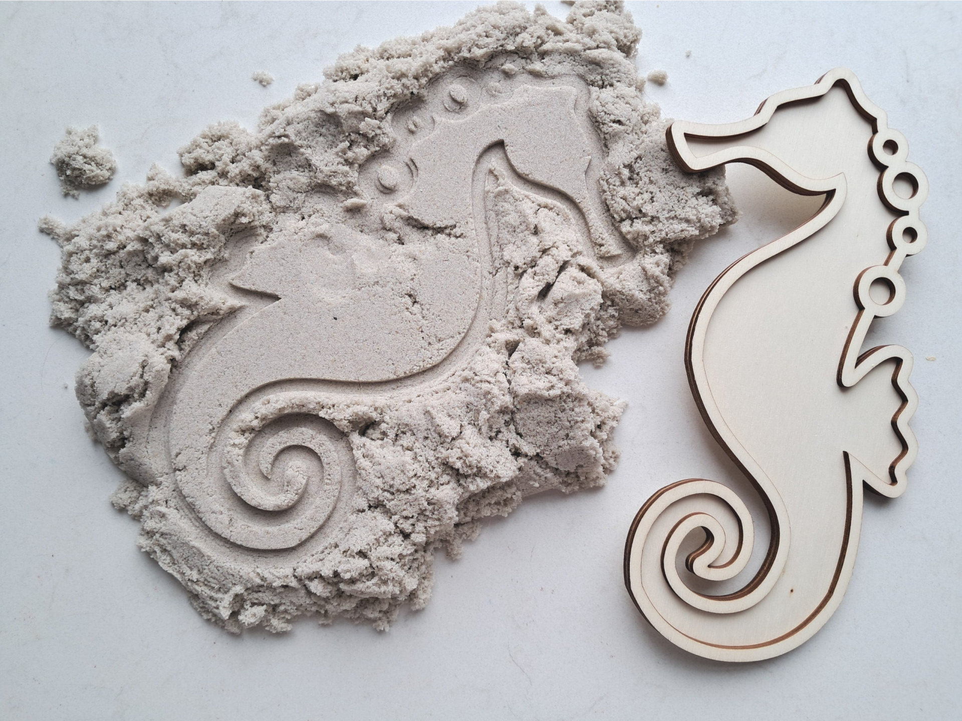 Denkzij zijn mooie vorm is hij ook perfect als stempel in kinetisch zand. Een mooie afdruk en een grote glimlach!